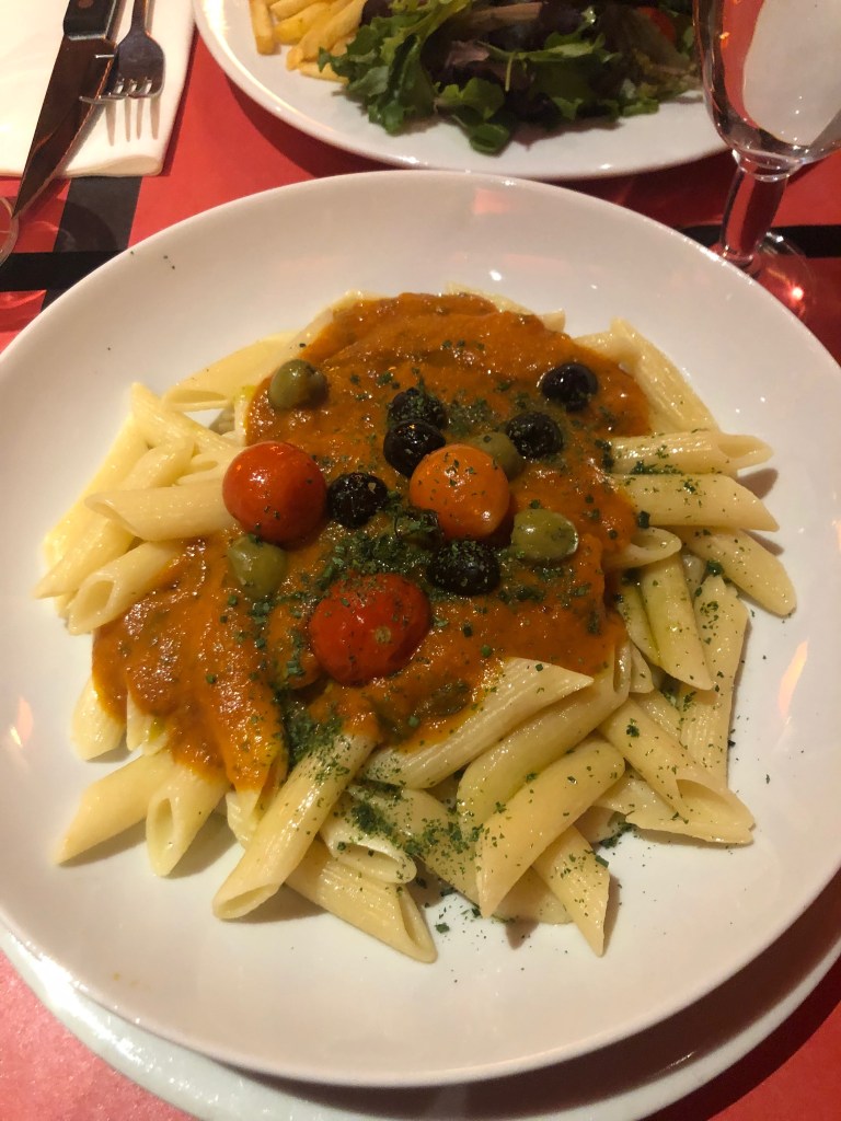 By the time we arrived in Paris on Thursday, it was already dinnertime, so after getting settled in the hotel and traipsing around looking for somewhere to eat, we were all tired, starving, and not looking to get too adventurous. I suppose I could’ve been a lot more authentic in my choices of French cuisine during my stay, but escargot and bouillabaisse are just a little too far out of my comfort zone, and perhaps it’ll give me an excuse to come back! Anyway, for our first night at dinner I went for a tomato and basil pasta dish with olives, and after a long day of nibbling on packaged pastries on a bus, it was damn near the best thing I’d ever eaten.