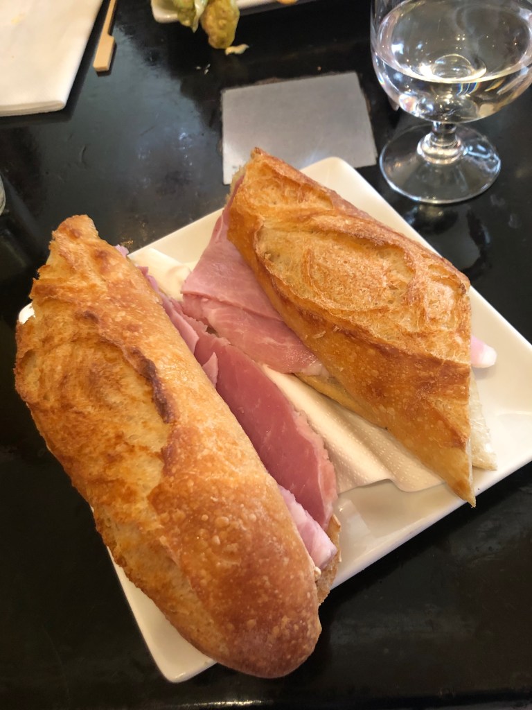 For lunch we ended up at another cafe (seriously, they are everywhere in Paris. If New York has a Starbucks on every block, then Paris has a cute bistro on every one). Now, when you take French classes in America, there’s several whole lessons on how to order food in restaurants, and they absolutely drill several specific foods into your head. One of them is un sandwich au jambon. If you don’t speak any French and guessed this means ham sandwich, you get a gold star today. Since this is something I remembered so vividly from classes at school, that’s what I decided to get for lunch. To be honest, the only real difference it had from an American ham sandwich was the substitution of a buttered baguette for regular bread, but I thought it was pretty tasty.