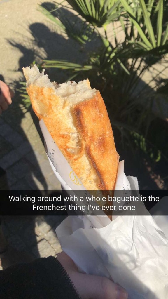 The day after that we were in Disney, eating burgers in Tomorrowland and muffins from the Main Street bakery and feeling right at home, so there’s not much to tell there. Beyond that, the only other meal we got to eat in Paris was breakfast before we left to return to Wroxton, the same buffet as before (though I did wrap several croissants up in napkins and stuff them in my backpack to take on the long bus ride back. It was a huge flaky mess and totally worth it). The very last thing I did before leaving, though, was to run down the street to the bakery and buy a baguette for myself. When you walk around Paris you really do see people with whole baguettes sticking out of the baskets on their bicycles, or you see them just walking and eating one, and that’s exactly what I did. After completing my only transaction entirely in French, where I had to haltingly ask for “un sac” because they only wrapped a little paper around the center of the loaf and I wanted to take it on the bus, I strolled back to the pickup point, munching on my baguette and feeling pretty proud of myself for getting the Parisienne experience.